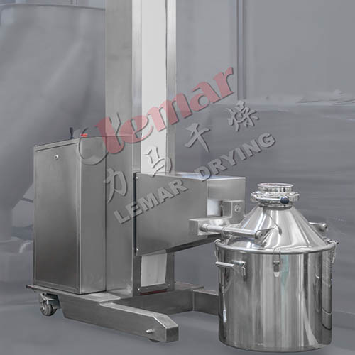 該機(jī)主要由底盤、立柱、提升系統(tǒng)等部件組成。工作時(shí),先將裝有物料的料斗推入料斗提升機(jī)的提升叉架上,然后啟動(dòng)提升按鈕,料斗做提升運(yùn)動(dòng),料斗到位后轉(zhuǎn)動(dòng)底盤與加料的設(shè)備密閉對(duì)接,開啟出料蝶閥,使物料密閉轉(zhuǎn)移到下一工序。