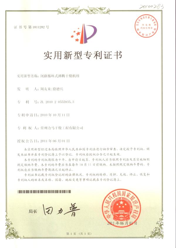閉路循環(huán)式沸騰干燥機(jī)組專利證書