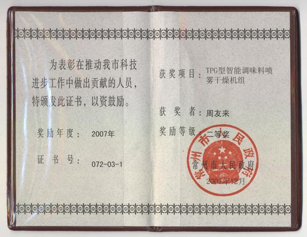 TPG型智能調(diào)味料噴霧干燥機組獲獎證書