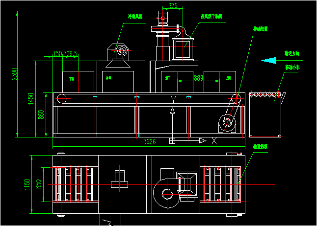 料框超聲清洗完后由吊車吊到移動小車上,移動小車推至烘干機上料端可以用插銷鎖緊或不鎖緊,小車不會移動或跑偏,移動小車與烘干機上料端齊平銜接好后,操作工手動把料框推至烘干機上料端,此時烘干機輸送裝置處于停止狀態(tài),因為烘干機運行是步進運行,所以在輸送裝置上裝有高位檔筋板,操作工只需把料框推至上料端的高位檔筋板上即可,此時操作工可按啟動按鈕,烘干運行開始,隨著設(shè)計好的步距及設(shè)定好的時間進行烘干、冷卻直至下料,下料時如操作工未取走料框此時輸送會自動停止運行,直至操作工把料框推至移動小車輸送才恢復(fù)運行,周而復(fù)始。