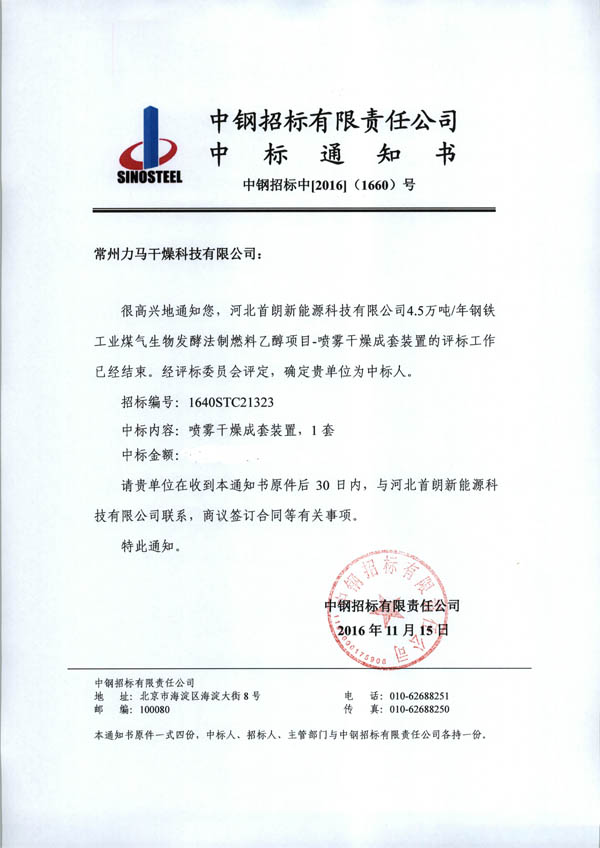 經(jīng)過公開招標(biāo),首鋼公司發(fā)酵廢液的深化處理,轉(zhuǎn)化成蛋白飼料用特大型噴霧干燥機(jī)組,最終定標(biāo),在眾多的參與投標(biāo)的入圍企業(yè)中,力馬企業(yè)一舉中標(biāo),中標(biāo)金額巨大。